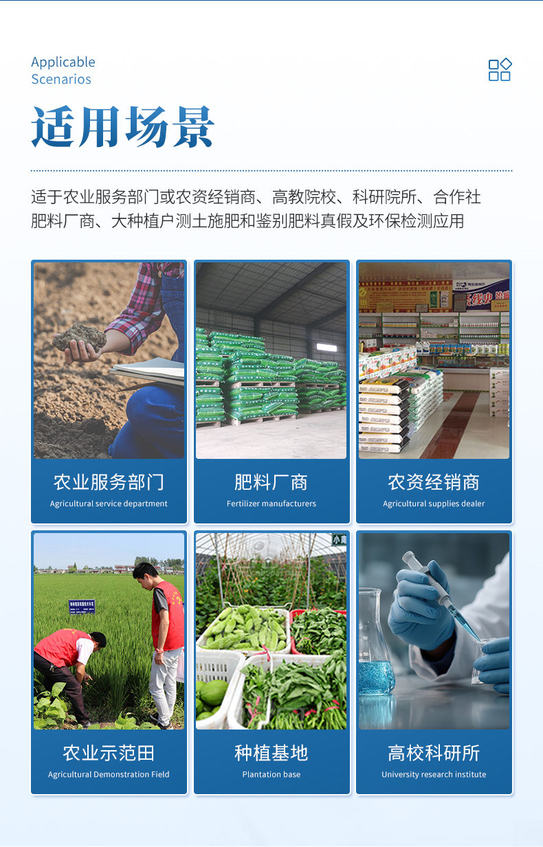 配套齊全:該儀器無需用戶自配附件,相當于一個小型實驗室。適于農業服務部門或農資經銷商、合作社、肥料廠商、大種植戶測土施肥。