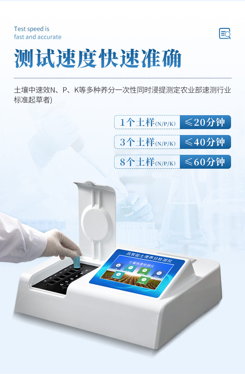 測試速度:正常熟練程度下,測一個土壤樣品(N、P、K)三項需要20分鐘(含藥劑準備及土樣前處理時間),同時檢測三個土壤樣品(N、P、K)≤40分鐘,同時測8個土樣≤1小時。